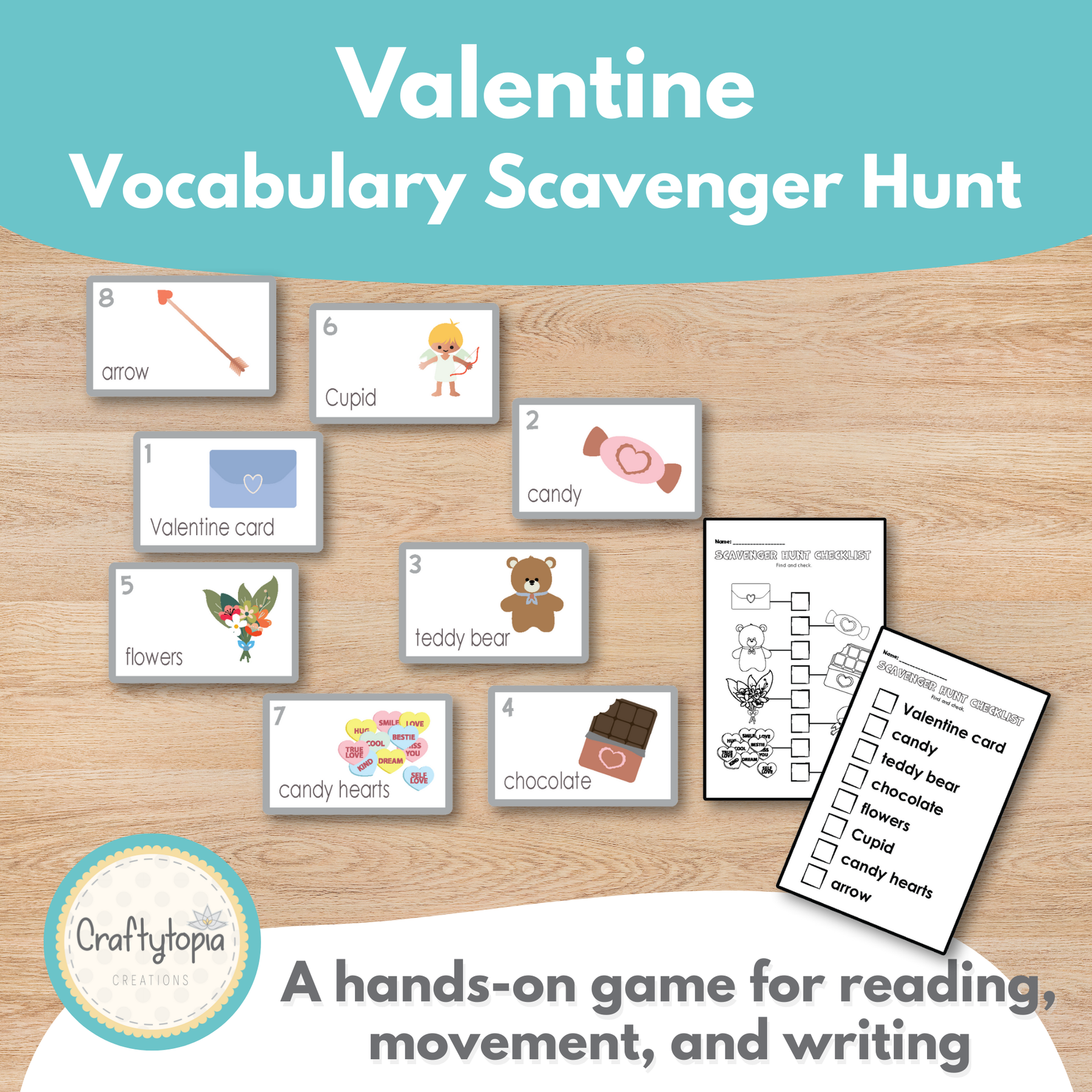 Make Valentine’s Day active with this Valentine Scavenger Hunt! This hands-on vocabulary activity gets students moving around the room while practicing reading, speaking, and writing Valentine-themed words in an engaging way.