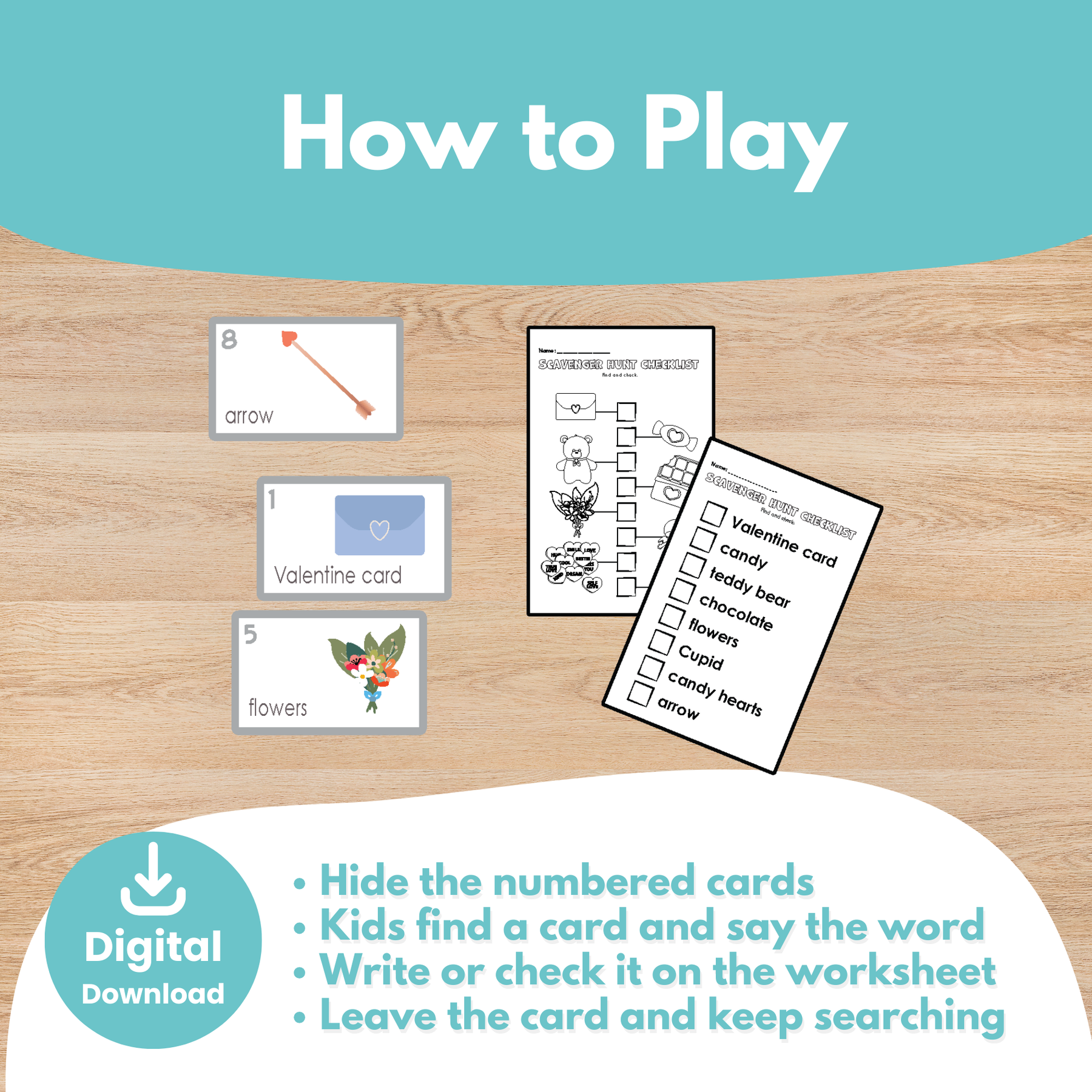The instant download includes instructions and the pieces you'll need to do this Valentine Flashcards and Scavenger Hunt! Get ready for creative fun with just a few basic supplies from home or school.