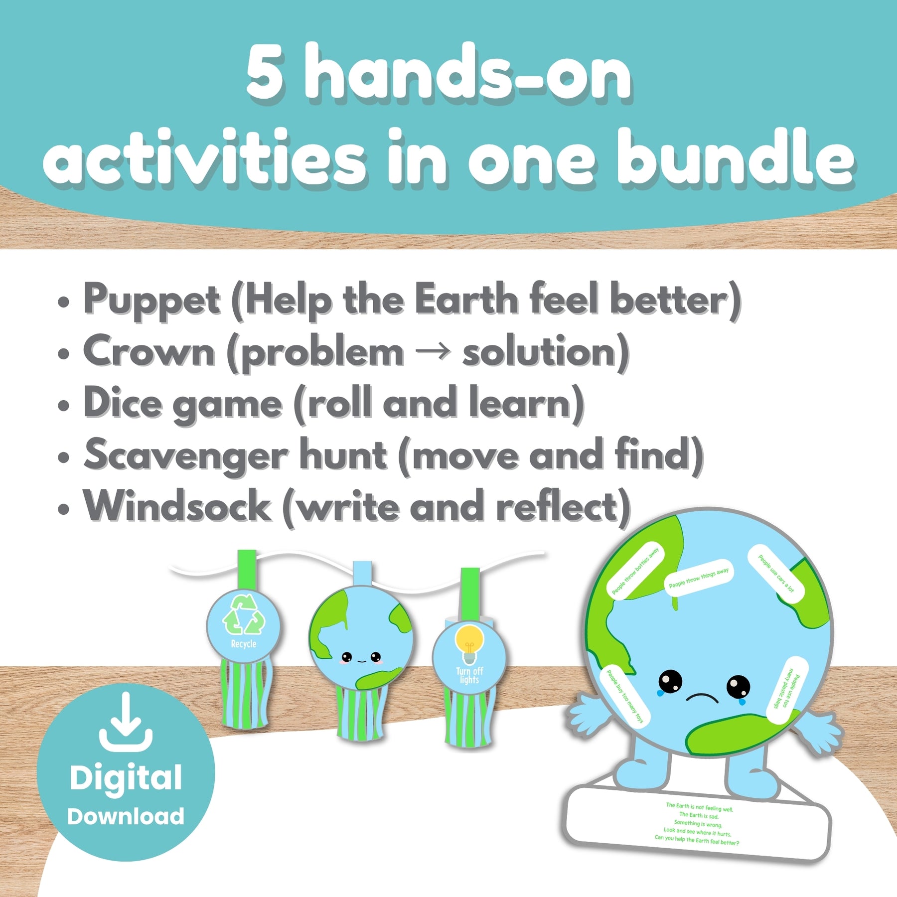 A kawaii Earth puppet, 10 eco-action band-aid cards, an emergent reader story script, and a First Aid kit prop. Kids "heal" the Earth by applying eco-actions — one of our most loved activities for building environmental empathy.